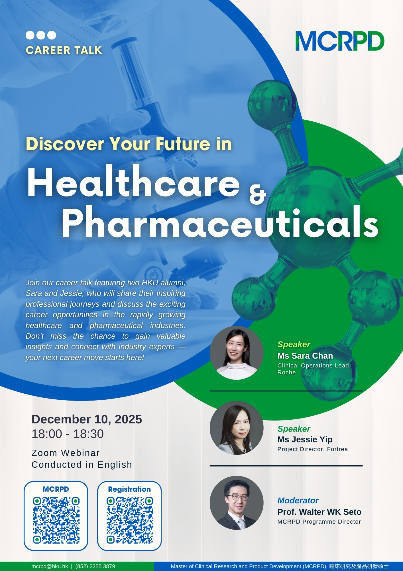 MCRPD is an interdisciplinary programme (with 1-year full-time and 2-year part-time options) designed to equip students with the professional knowledge and practical skills required to meet the increasing demand for talent in drug and medical device registration, clinical research management, and healthcare product development.
